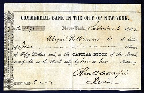 New York, NY, 1842. 5 Shares, I/U stock, black on thin onion skin type of paper, S/N 1872, ornate small counterfoil on small size certificate, VF with toning, early NY bank stock.
