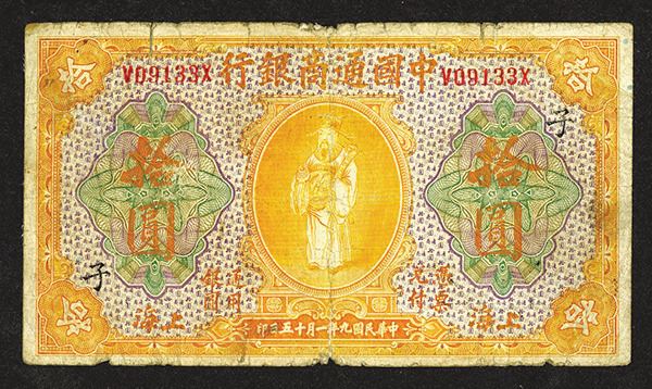 Shanghai, China, $10, P-5b, S/M#C293-44, Issued banknote, Yellow on m/c, back yellow, VG to Choice VG condition with normal wear for issue, small chips out of bottom and top edges and small tear at top right, Worthy at center, ABNC.