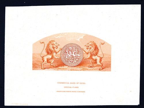 China, ND (ca. 1920), Large Die Proof vignette of Lions flanking Medallion, 4 by 3 inches that was used on the backs of the ABNC printed 1920 series of Commercial Bank of China notes, P-A134-136 and P-1 to P-8, Printed Orange-brown on india paper that is unmounted, Bottom imprint includes “Commercial Bank of China -SPECIAL C-1680 American Bank Note Company”, The vignette appears Choice Uncirculated. Rare banknote related vignette. ABNC.