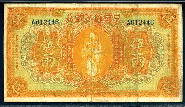 Shanghai. 5 Taels, P-A135a. Extremely rare Issued Banknote. Yellow-orange on m/c, Confucius standing at center, back is blue black instead of listed purple, S/N A012446, PMG graded Choice Fine 15, This is the only example of an issued Tael note from this series in PMG's census. Extremely rare to find issued. First time seen by cataloger in this form. ABNC.