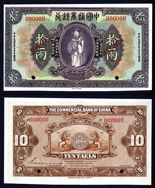 Shanghai, China. 1920, 10 Taels, P-A135s (S/M #293-32), Specimen banknote, Confucius at center, Purple on m/c, back brown, Red specimen overprint, POC and “000000” serial numbers. Choice uncirculated. ABNC. Rare “Tael Issue”.