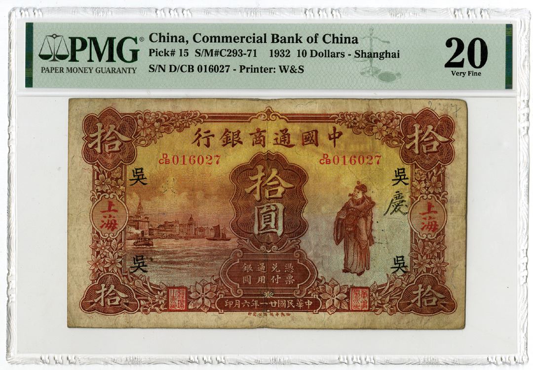 China. 1932. 10 Dollars - Shanghai, P-15 S/M#C293-71, Issued banknote, Brown on multicolor underprint, S/N D/CB 016027, PMG graded Very Fine 20 with comments "Previously Mounted, Annotations." Printer: W&S.