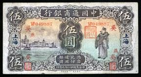 Shanghai. 1932. $5. P-14a. (S/M # C293-70a) Issued banknote. Purple on m/c face, Confucius on right, harbor scene on left. Crisp paper with relatively few and light folds. With various Chinese control character overprints. Note appears to be in VF to VF+ condition. Scarce and attractive.