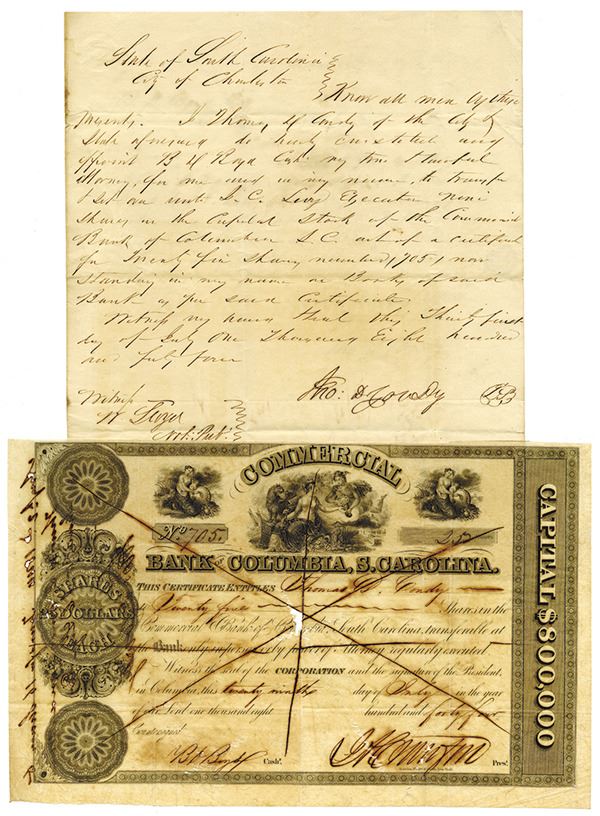 Columbia, South Carolina. 25 Shares I/C Stock Certificate, Black print on black border with company title at top and allegorical figures at either side of title. Large "X" across center of certificate cancelling it with hole at center and ink burn in a few areas, Fine-VF condition. Included in lot is a stampless letter from Charleston, SC from B. D. Boyd who was the cashier of the bank, who had transferred 9 shares. Printer: RW&H. Attractive 1830's design by well known security printer.
