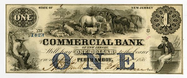 Perth Amboy, NJ., July 10th, 1856, Wait 1956, R-2. Commercial Bank of New Jersey was incorporated in 1822. It failed in 1851 and after bring revived finally closed during the Panic of 1857. Choice VF to XF. DW&C.