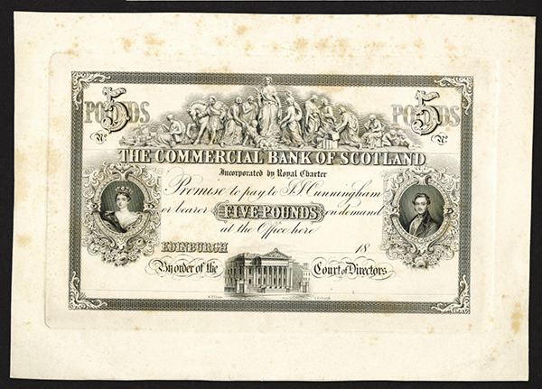 Scotland. 5 Pounds Proof. SCWPM S296 for type, unlisted in this form). Victoria and Albert vignettes at left and right, Allegorical statue group across top. Plate engraved by W.H. Lizars, Edinburgh. As made. Light foxing to card stock which has nice margins around plate impression.