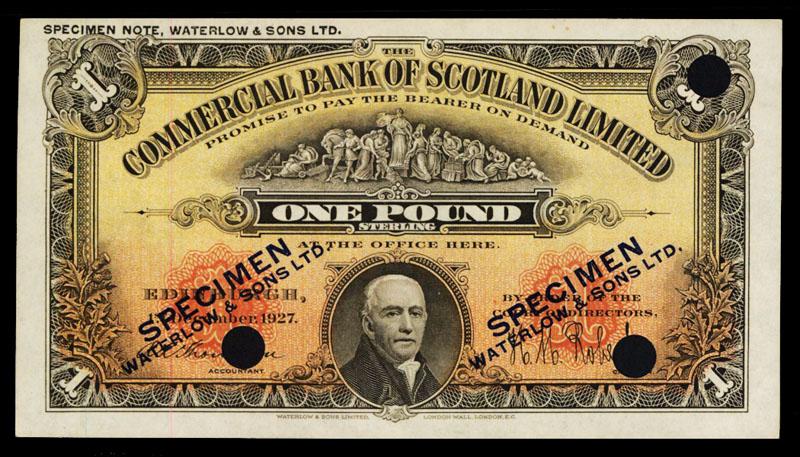 Commercial Bank of Scotland, 1927 Color Trial Specimen. Edinburgh, Scotland. Dec.. 1, 1927, 1 Pound, P-S331s. Unlisted Color Trial SPECIMEN. John Pitcairn. Brown on yellow and orange instead of issued blue on yellow and orange, back brown. PMG graded Choice Uncirculated 64 EPQ (Exceptional Paper Quality). Waterlow & Sons. Rare Color trial of this scarce note.
