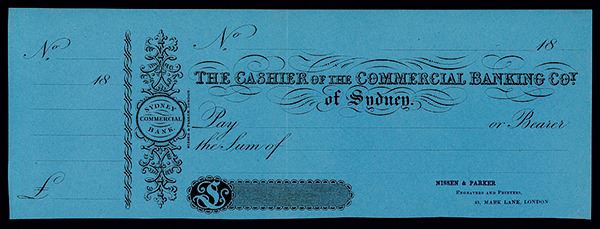 18xx (ca.1860-80's). Sydney, Australia. Specimen Check of "The Cashier of the Commercial Banking Company of Sydney". Nissen & Parker, Printer. Scarce Australian sample check.