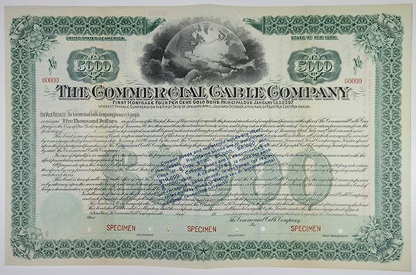 New York, 1897 (due 2397). $5000 Specimen 4% First Mortgage Gold Bond, Black text with green border and underprint, Depiction of globe at top with continents connected by telegraph wire routes. Red specimen overprints, "00000" serial numbers, POC's, and overprint paragraph regarding coupon bonds vs registered bonds. VF condition, with principal date stating it is due 2397. Printed by FBN. The Commercial Cable Company provided the first direct telegraph route from America to the Philippines, China, and Japan.