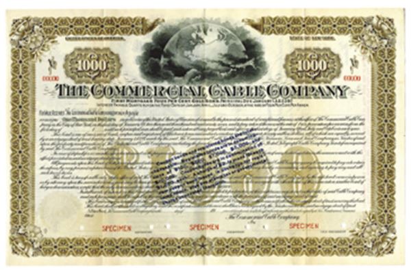 New York. $1000 Specimen 4% Registered 1st Mortgage Gold Bond, Black print on brown border and under tint on horizontal format, Image of the planet at top with telephone wires connecting USA and UK across the Atlantic Ocean, Specimen overprints and POC's, Fine-VF condition with minor toning along fold lines condition, FBNC.