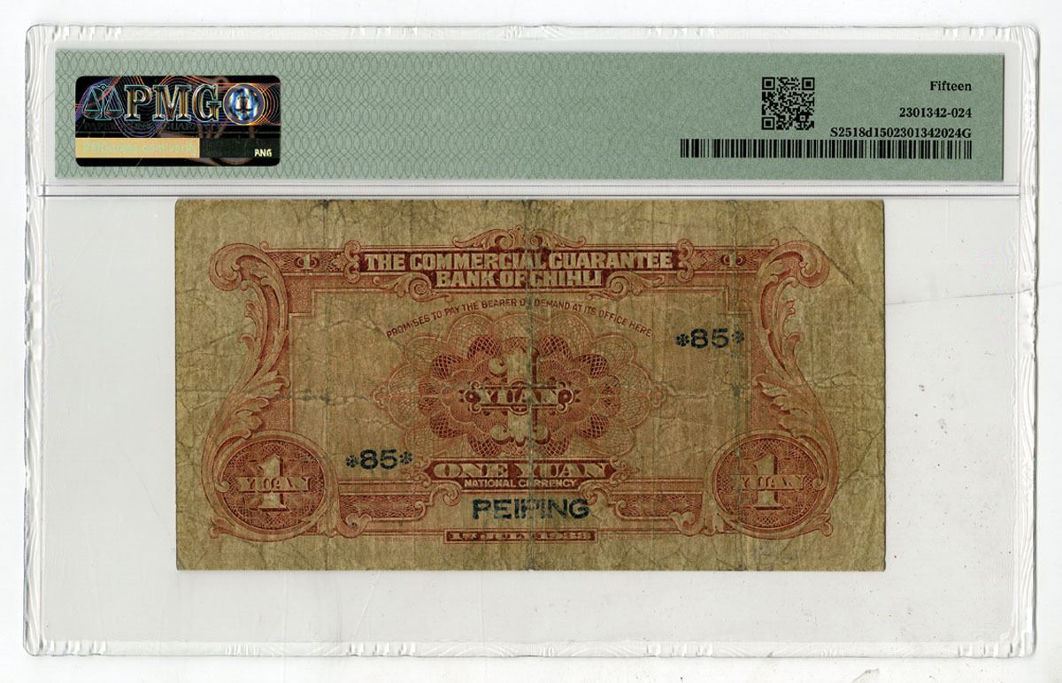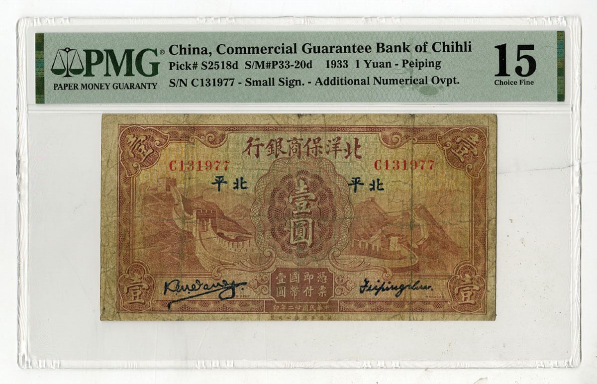 Peiping, China, 1933. 1 Yuan, P-S2518d S/M#P99-20d, Issued Banknote with additional numerical overprint "85", Brown printing with Great Wall at left and right, Back is brown, S/N C131977, PMG graded Choice Fine 15, W&S.