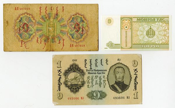 Mongolia. Issued 1 Tugrik, 1925, P-A7, VG to Fine; 1 Tugrik, 1941, P-21, VF w/corner damage; and modern 1 Tugrik, 2008, Uncirculated.