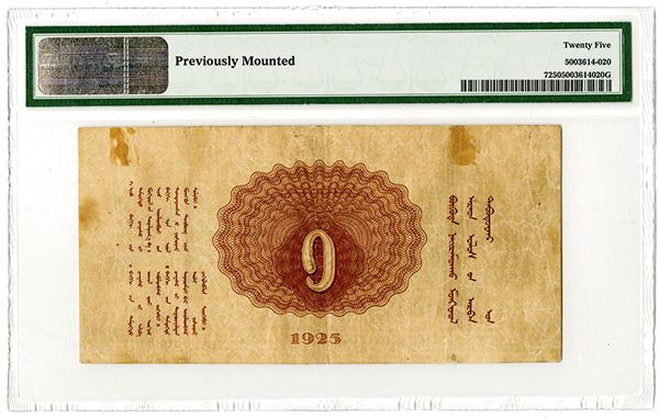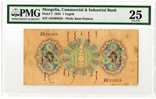 Mongolia. Issued 1 Tugrik, 1925, P-7. PMG graded Very Fine 25 (Cert # 5003614-020).