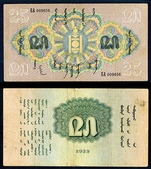 Mongolia, 1925, 25 Tugrik, P-11, Issued banknote, Brown & m/c, S/N EA009656, PMG graded Very Fine 25 Net with notation of repairs of small splits on top and bottom middle from strong folds.