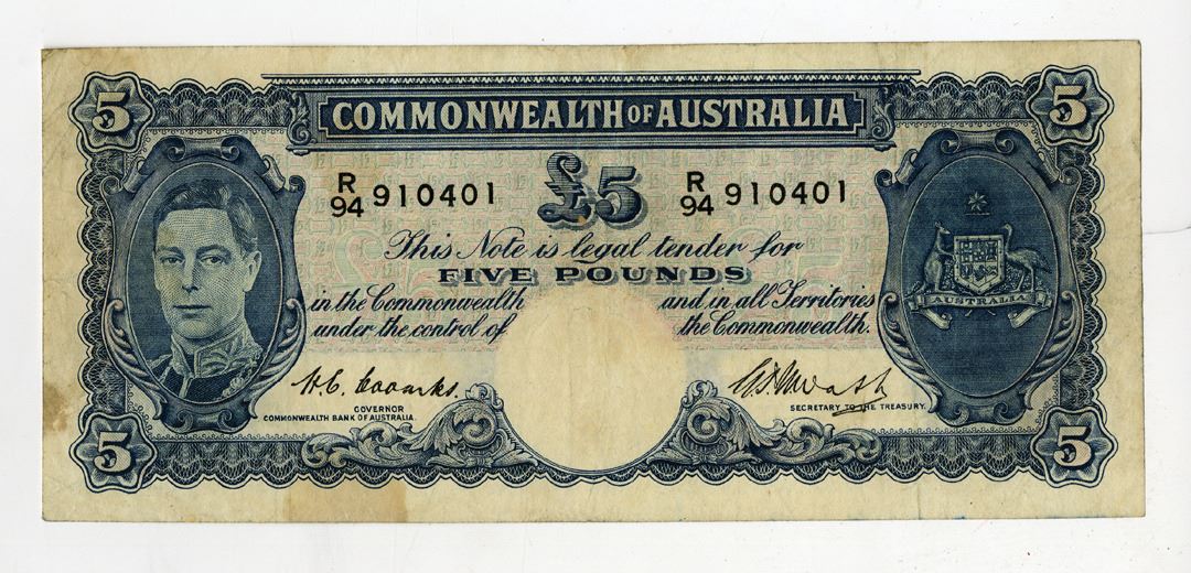 Australia, ND (1949). 5 Pounds, P-27c, Issued Banknote, Coombs | Watt Signatures, Deep blue on m/c underprint with portrait of King George VI at left and Australian Arms at right, Back is blue with workers at left and denomination at right, S/N R/94 910401, VF condition.