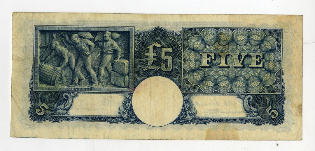 Australia, ND (1949). 5 Pounds, P-27c, Issued Banknote, Coombs | Watt Signatures, Deep blue on m/c underprint with portrait of King George VI at left and Australian Arms at right, Back is blue with workers at left and denomination at right, S/N R/94 910401, VF condition.