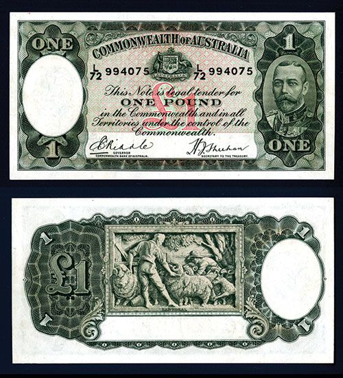 Australia, ND (1933-38), 1 Pound, P-22a (R28), Issued Banknote, Portrait of King George V at right, Dark green on m/c, S/N L/72 994075, Signature E.C. Riddle - H.J. Sheehan, PMG graded Choice Very Fine 35, Extremely attractive note that at first glance appears Choice XF.