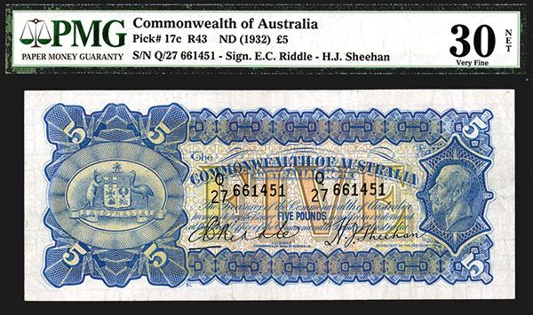 Australia, ND (1932), £5, P-17c, R43, rare 1932 Riddle | Sheehan signatures, PMG graded VF 30 NET with note of PVC, otherwise the note would have graded EF 40.