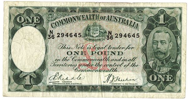 Australia, 1 Pound, P-22a, Issued, King George V at right, black on green on m/c, Riddle | Sheehan signatures, back green, VF condition with large even borders and margin, sharp corners and bright colors.