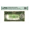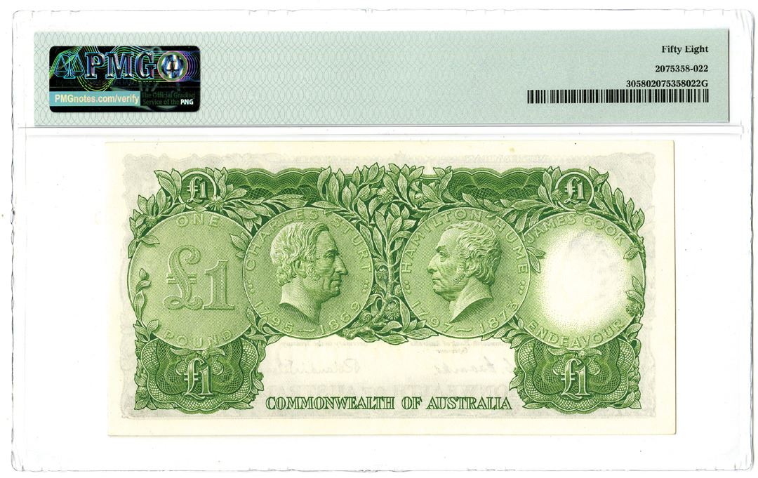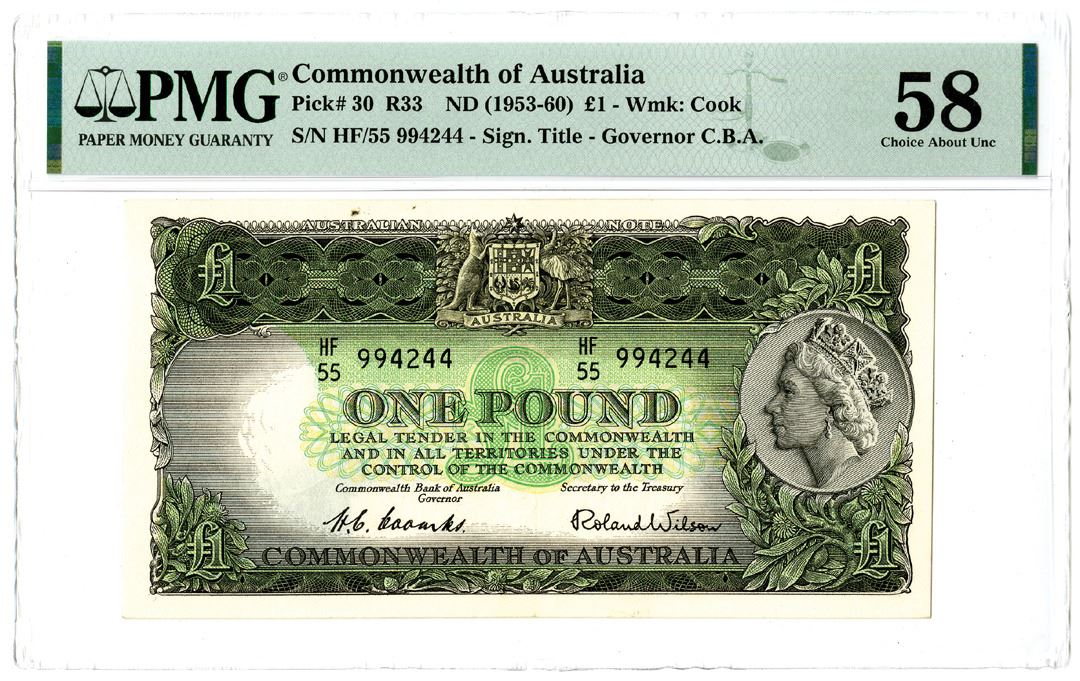 Australia. ND (1953-60). 1 Pound, P-30, R33, Issued Banknote. Dark green on m/c underprint with arms at upper center and portrait of Queen Elizabeth II at right. S/N HF/55 994244 with watermark of Captain Cook. PMG graded Choice About Uncirculated 58.