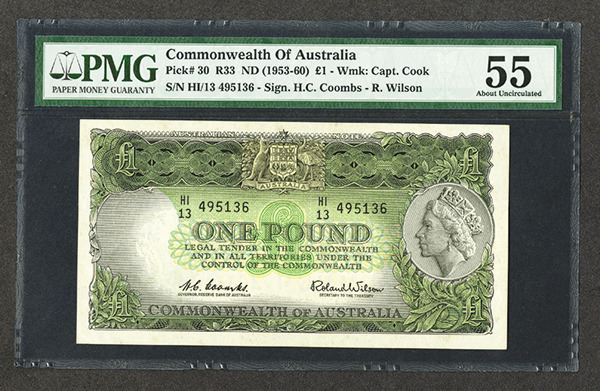 Australia, ND (1953-60), 1 Pound, P-30a (R33), Issued banknote, S/N HI/13 495136, PMG graded About Uncirculated 55, Attractive note.