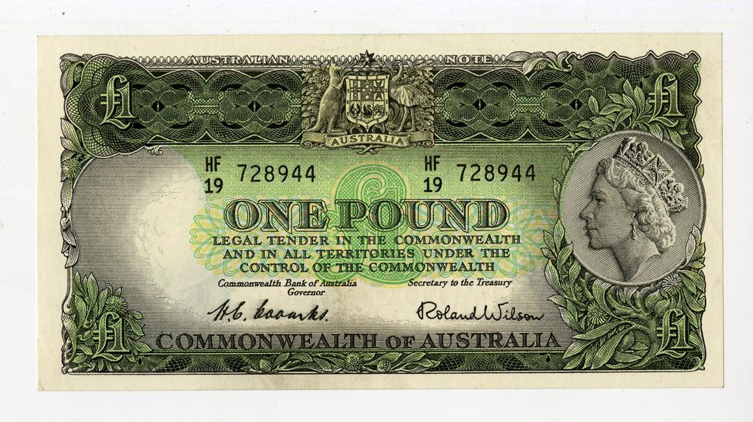 Australia....., ND (1953-60). 1 Pound, P-30a, Issued Banknote, Black on green and yellow underprint, Arms at top center with cameo portrait of Queen Elizabeth II at right, Back is green with facing portraits of Charles Sturt and Hamilton Hume, S/N HF/19 728944, Notes is Choice XF to AU condition. Attractive fresh appearing note with large even margins and sharp corners, appears CU at first glance.