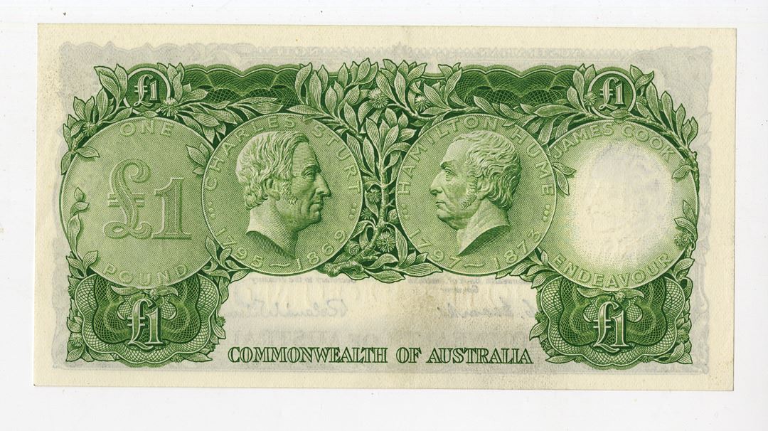 Australia....., ND (1953-60). 1 Pound, P-30a, Issued Banknote, Black on green and yellow underprint, Arms at top center with cameo portrait of Queen Elizabeth II at right, Back is green with facing portraits of Charles Sturt and Hamilton Hume, S/N HF/19 728944, Notes is Choice XF to AU condition. Attractive fresh appearing note with large even margins and sharp corners, appears CU at first glance.