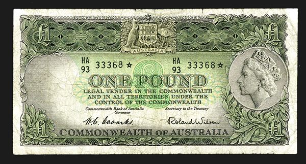 Australia, 1953, £1 Star Note, P-30*, R33S, RB10, Coombs | Wilson, S/N HA/93 33368*, PMG graded Choice Fine 15, scarce note.