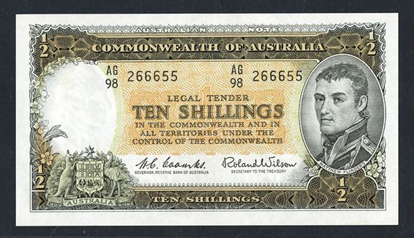 Australia, 10 Shillings, P-33a, R17, Issued, Brown on m/c underprint, S/N AG/98 266655, PMG graded Gem Uncirculated 65 EPQ, Sign. Title Governor R.B.A., not usually found this nice and should command a premium bid.