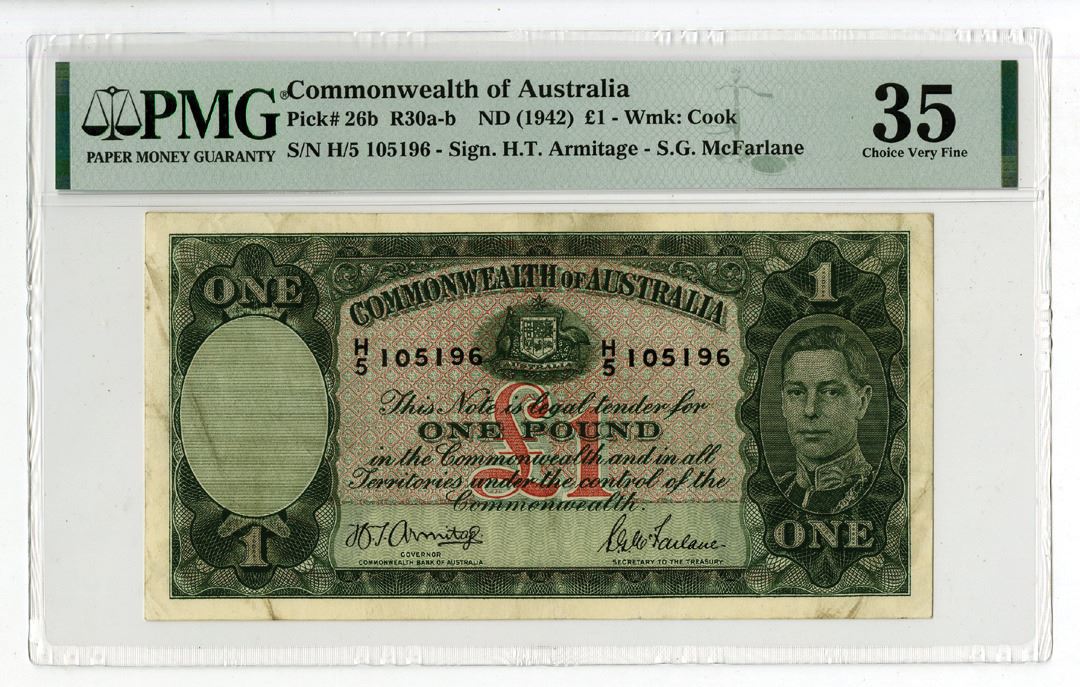 Australia, ND (1942). Commonwealth of Australia 1 Pound, P-26b, R30a-b, Issued Banknote. Black and green on m/c underprint with portrait of King George VI at right. S/N H/5 105196. PMG graded Choice Very Fine 35.