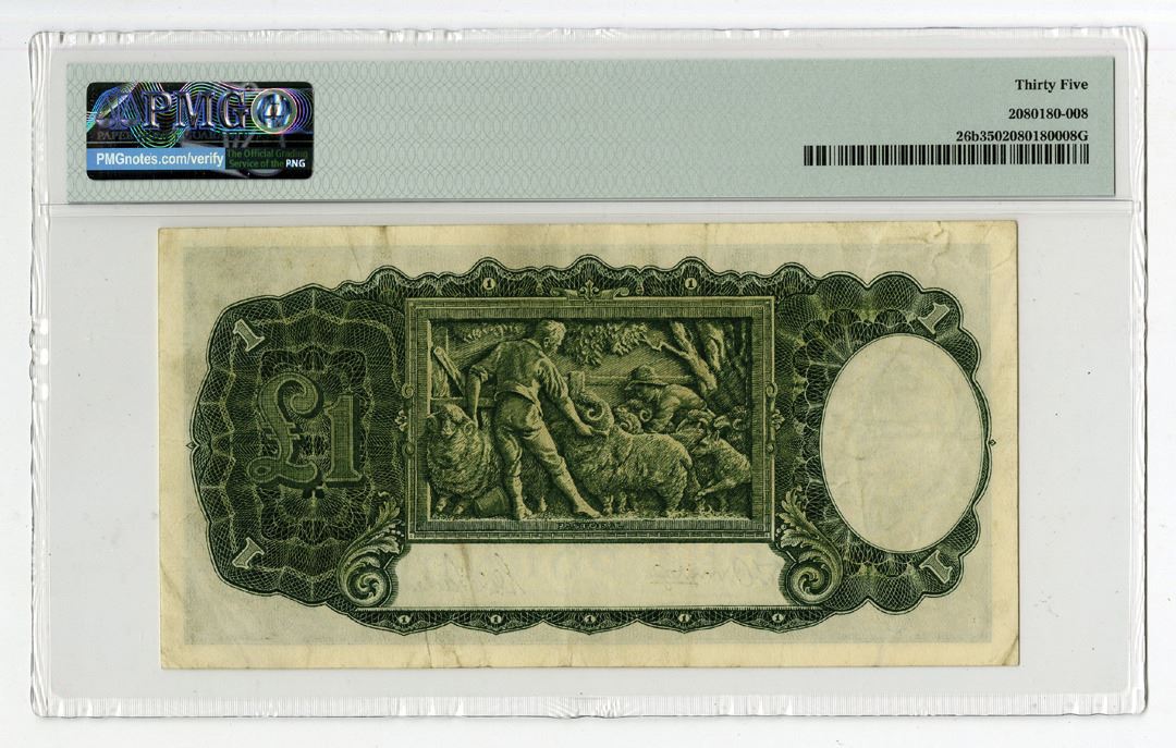Australia, ND (1942). Commonwealth of Australia 1 Pound, P-26b, R30a-b, Issued Banknote. Black and green on m/c underprint with portrait of King George VI at right. S/N H/5 105196. PMG graded Choice Very Fine 35.