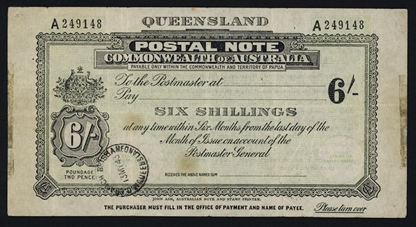 Territory of Papua. 1943. 6 Shillings, P-Unlisted. Partially issued but unsigned Postal Note. Issued in Brisbane and dated 13 May '43 in circular hand stamp on face. Under title in smaller print is text "Payable Only Within The Commonwealth and Territory of Papua". Possibly used for small purchases or for change since there is evidence of wear and folding, but it was never filled out or possibly it was intended for use and never issued or cashed. Fine condition with pin holes on upper left and toning on left and right margins. Black on light green undertint with arms on upper left, back with black text instructing how it was supposed to be cashed. John Ash, Australian Note and Stamp Printer imprint on bottom. During World War II in the battles of the Pacific, Papua was governed by an Australian military administration from Port Moresby. General MacArthur occasionally made it his headquarters there during the war. Interesting and rare War time Australian Postal Note for use in the Territory of Papua (and New Guinea).