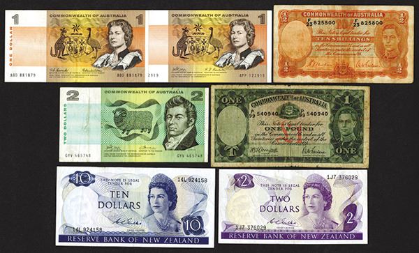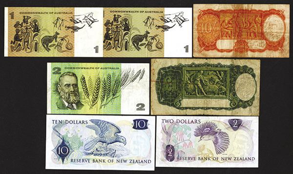 Australia. 10 Shillings, 1 Pound. George VI. SCWPM 25a; 26b; 1, 2 Dollars SCWPM 37a, c; 38d; New Zealand. 2, 10 Dollars, SCWPM 164b; 166b. Generally Very Good-Fine. 7 pieces.