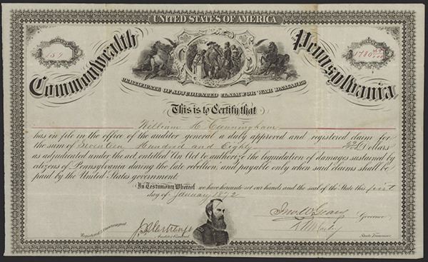 Pennsylvania, 1872, $1780.69, Certificate of Adjudicated Claim for War Damages Issued and Uncancelled, Black print with black ornate border Pennsylvania seal top center and portrait of Ulysses S. Grant bottom center, S/N 159. Fine to VF condition with creases from folding, ABNC. In 1849, after military service in the Mexican War, President James Polk appointed John Geary postmaster of San Francisco. In 1850, he was elected that city's first mayor. President Pierce appointed him governor of the controversial Kansas Territory in 1856, where he served for six months. Geary County, Kansas, was renamed in 1869 for John Geary. Geary was a general throughout the Civil War, serving at Cedar Mountain, Chancellorsville, and Gettysburg and was wounded several times. At the battle of Wauhatchie, Tennessee, Jefferson Davis ordered his six thousand Confederate troops to attack Geary's 1,500. During the battle, Geary's son Edward died in his arms but Geary won the battle. After Sherman's destruction of Atlanta, Geary accepted the peaceful surrender of Savannah, Georgia, and became the military governor of the city in December 1864. Governor Geary died unexpectedly of a heart attack at age 53 on February 8, 1873. This Pennsylvania Bond was issued 1 year before he died.