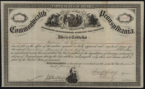 Pennsylvania, 1872, $1780.69, Certificate of Adjudicated Claim for War Damages Issued and Uncancelled, Black print with black ornate border Pennsylvania seal top center and portrait of Ulysses S. Grant bottom center, Fine condition with creases from folding, ABNC.