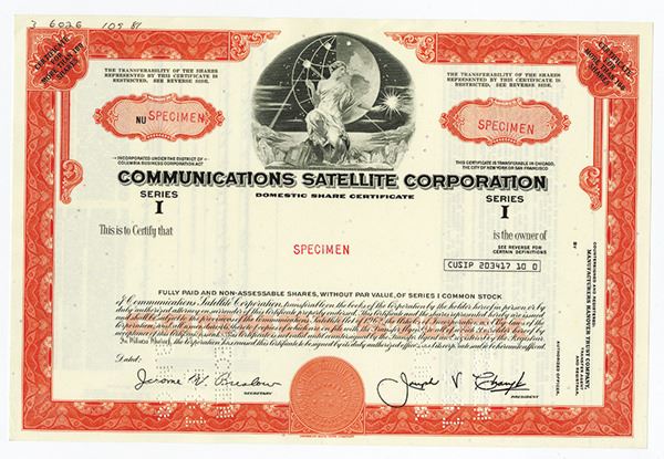 Washington D.C. >100 Shares Series 1 Common Stock Specimen Certificate. Black print with a pink/orange border and under print. Vignette of a woman sitting on the moon, with the earth behind her, holding communication lines. Specimen overprints, POC's, XF condition with some writing at left upper hand corner. ABNC.