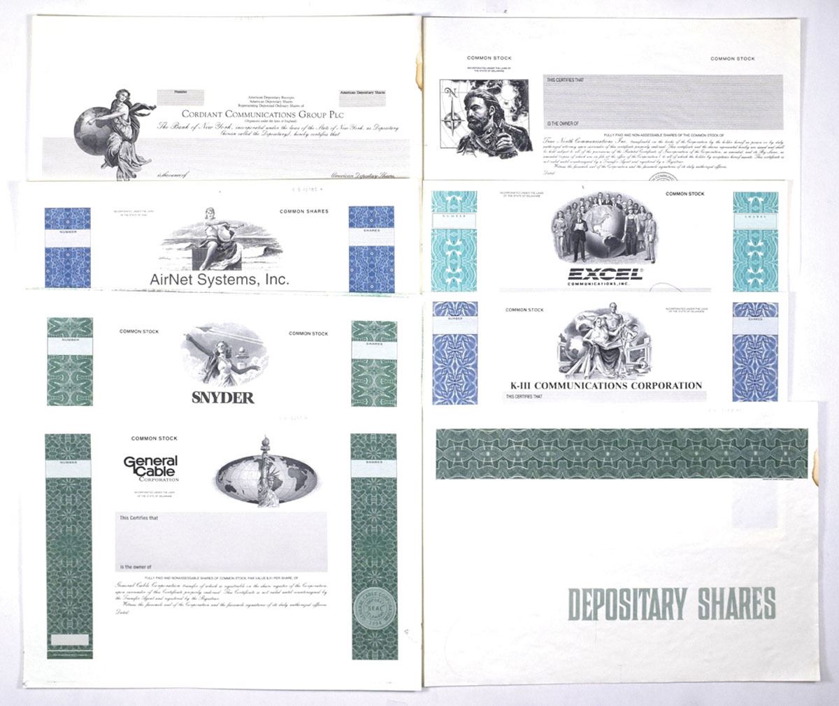 Lot of 7 items, featuring specimen stock certificates from companies in the communications, cable, and media sectors. Includes: Cordiant Communications Group PLC, an international marketing communications firm, specimen with gray border; AirNet Systems, Inc., specializing in time-critical air transportation, specimen with blue border; Snyder Communications, Inc., provider of outsourced marketing services, specimen with green border; General Cable Corporation, global manufacturer of copper and fiber optic wire and cable, specimen with green border; True North Communications Inc., an advertising and marketing company, specimen with gray border; Excel Communications, Inc., long-distance service provider, specimen with turquoise border and cancellation mark; K-III Communications Corporation, diversified media and publishing firm, specimen with blue border; and an unbranded specimen for Depositary Shares, featuring a green patterned top border. All certificates are face-only with blank reverses. Overall condition is Very Fine to Uncirculated, with minor edge wear on one item.