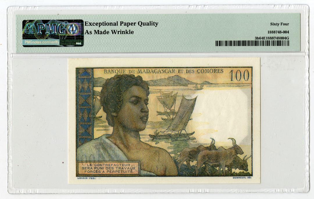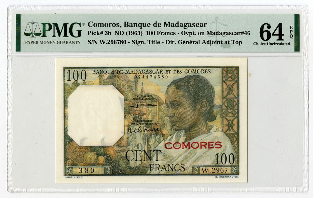 Comoros, ND (1963). 100 Francs, P-3b, Issued Banknote, M/c printing with woman at right, Palace of the Queen of Tananariva in background, S/N W.296780, PMG graded Choice Uncirculated 64 EPQ with comment "As Made Wrinkle."