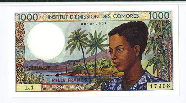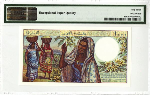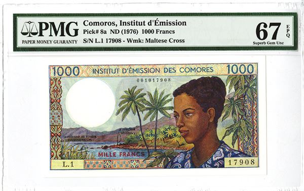 Comoros, 1000 Francs, P-8a, Issued, Watermark: Maltese Cross, PMG graded Superb Gem Uncirculated 67 EPQ.