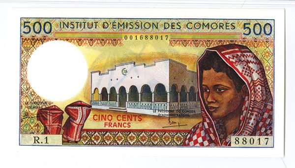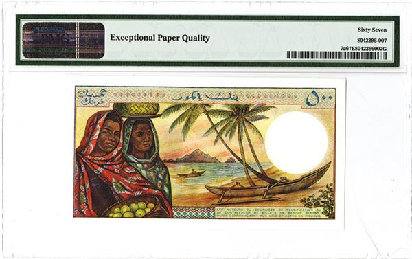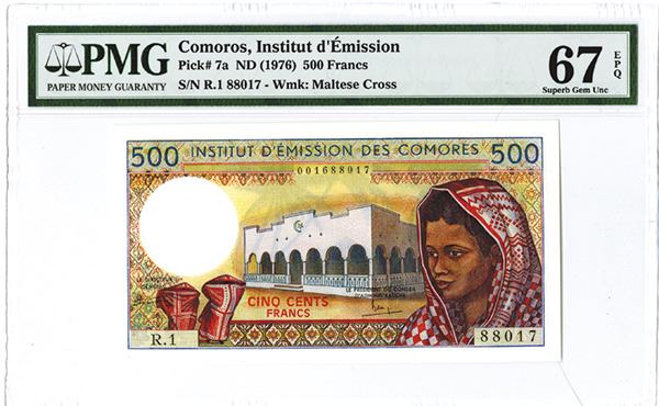 Comoros, 500 Francs, P-7a, Issued, Watermark: Maltese Cross, PMG graded Superb Gem Uncirculated 67 EPQ.