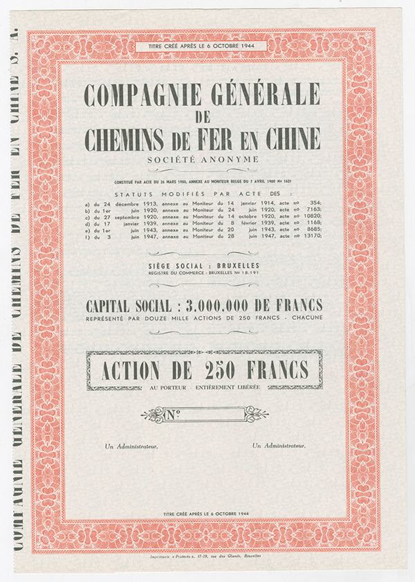 China. (Issued in Belgium). General Railway Company in China, 250 Francs Specimen Coupon Bond, Black print on orange border and gray under tint printed in French, VF-XF condition. Rare China specimen. First time seen by our firm.