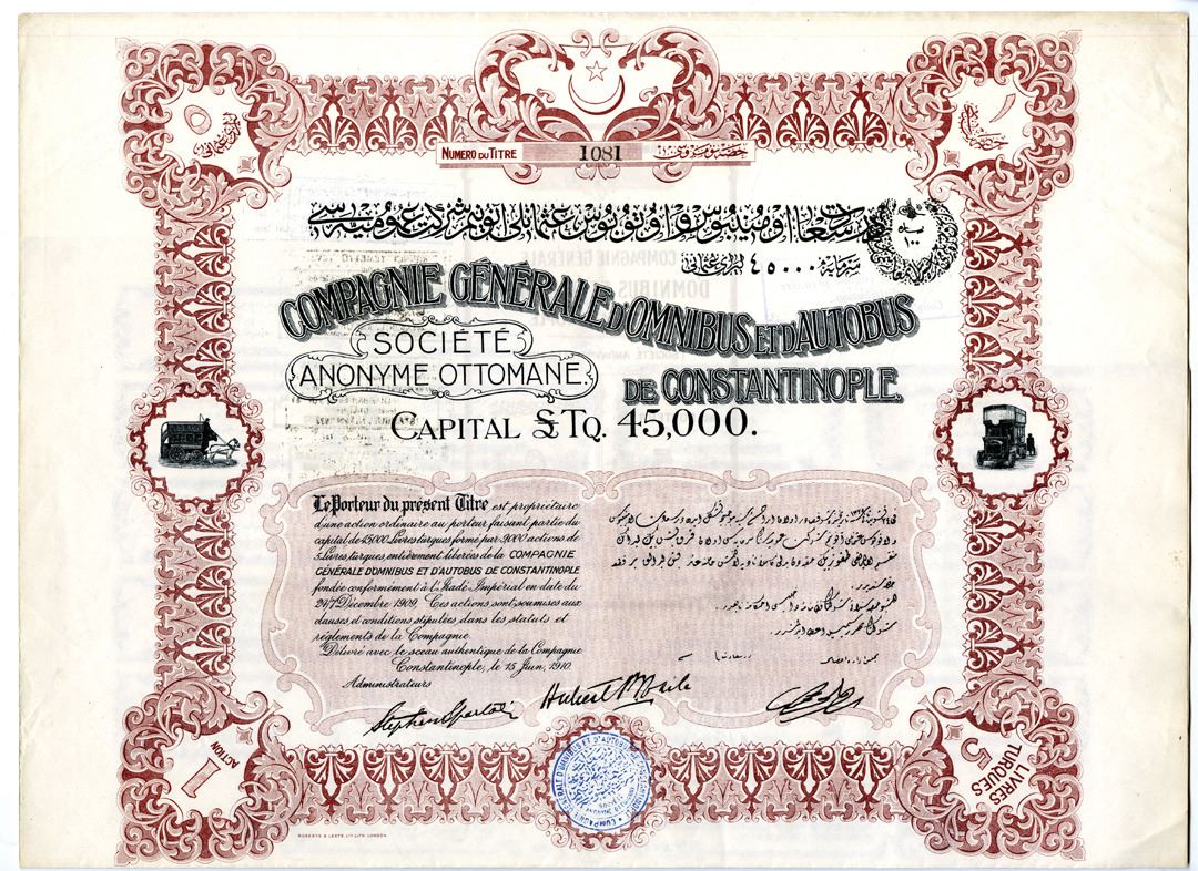 Constantinople, Turkey. 1910, I/U, 1 Share = 5 Livres Turques, Dividend coupons on bottom, black printing on red-brown ornate border, Double decker bus at right and horse drawn buggy at left, XF condition, Roberts & Leete, Lith, London. Very early automobile related certificate.