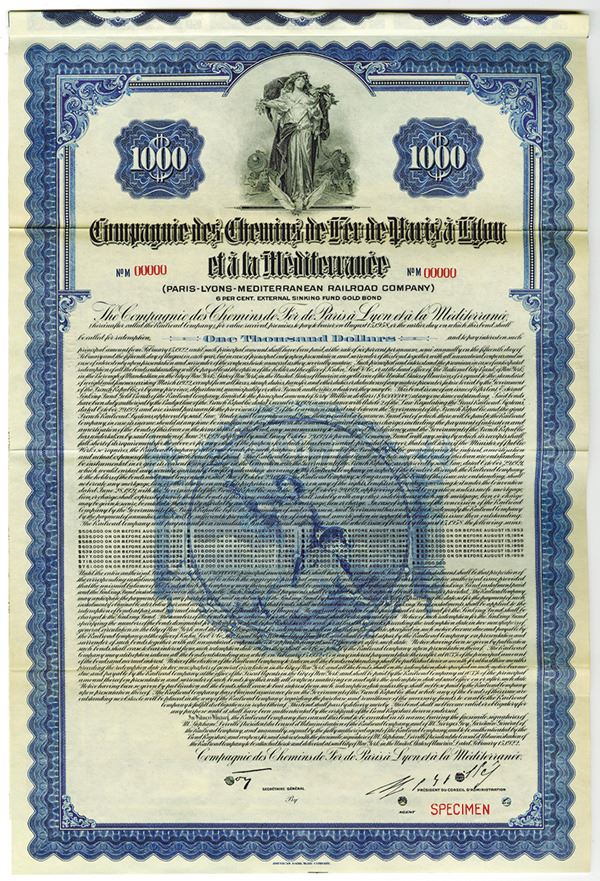 France, 1922. $1000 Specimen 6% External Sinking Fund Gold Coupon Bond, Black text with blue borders and undertint, Allegorical woman at top center flanked by approaching trains. Red specimen overprint, 00000 serial numbers, and POCs. VF condition, ABNC.