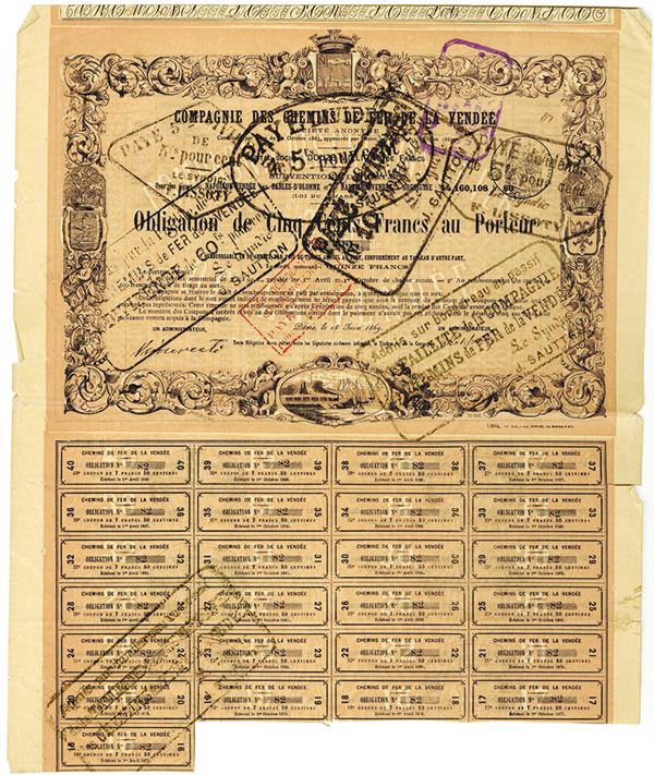 France, 1869. 500 Francs I/C Coupon Bond in French, Black text with ornate black border, salmon colored background. Cancelled stamps throughout. Fine condition. Vendee Railways Company.