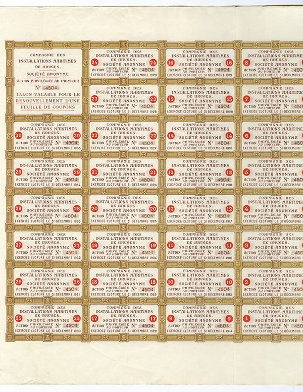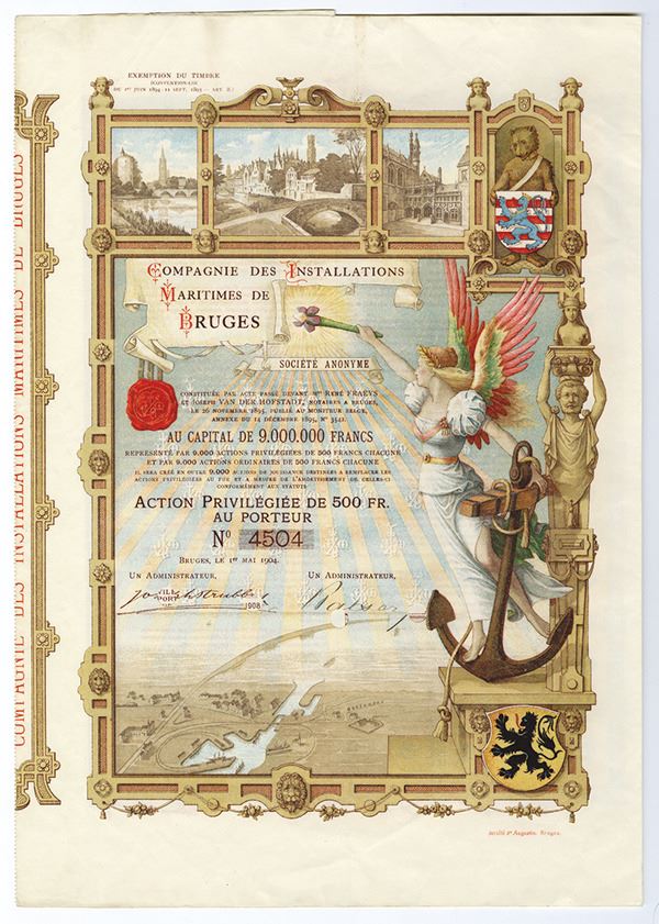 Bruges, Belgium. 500 Franc bond, 1904, No. 4504. Colorful certificate with views of Bruges, the coat of arms, and a winged allegorical female with a large anchor. Uncancelled coupon. POC's, Extremely Fine. (John E. Herzog Collection)
