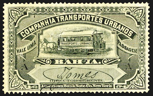 Bahia, Brazil. 57 x 35mm, gray, horse drawn streetcar, perforated edges, ABNC. VF-EF, pinholes.