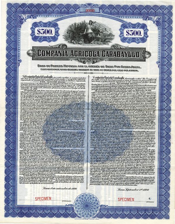 Peru. $500 Specimen 7% First Mortgage Bond. Black print with ornate blue border and under print. Vignette of allegorical figure sitting in front of plants and other agricultural items. All coupons attached. POC's and red SPECIMEN overprints. VF-XF condition. ABNC.