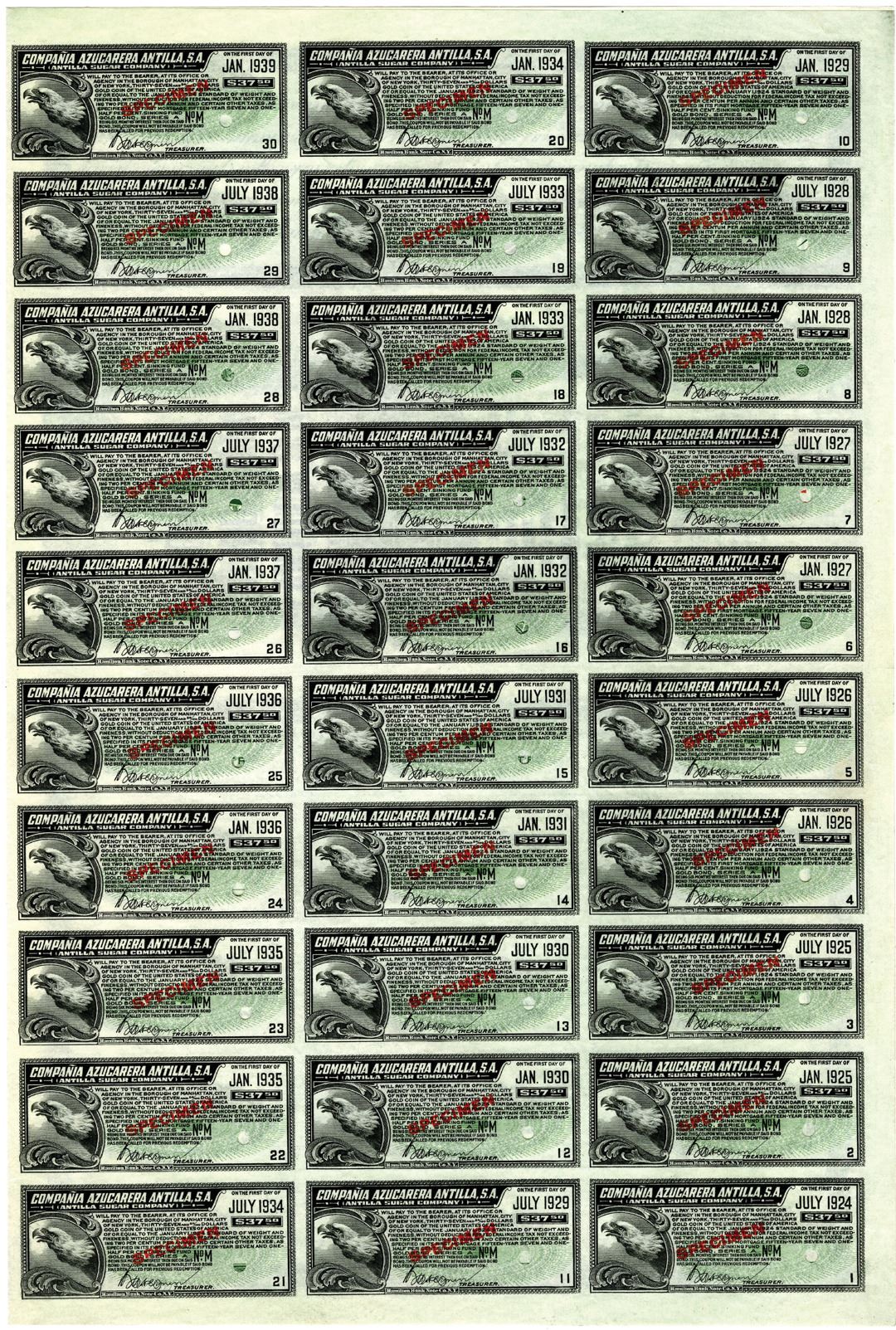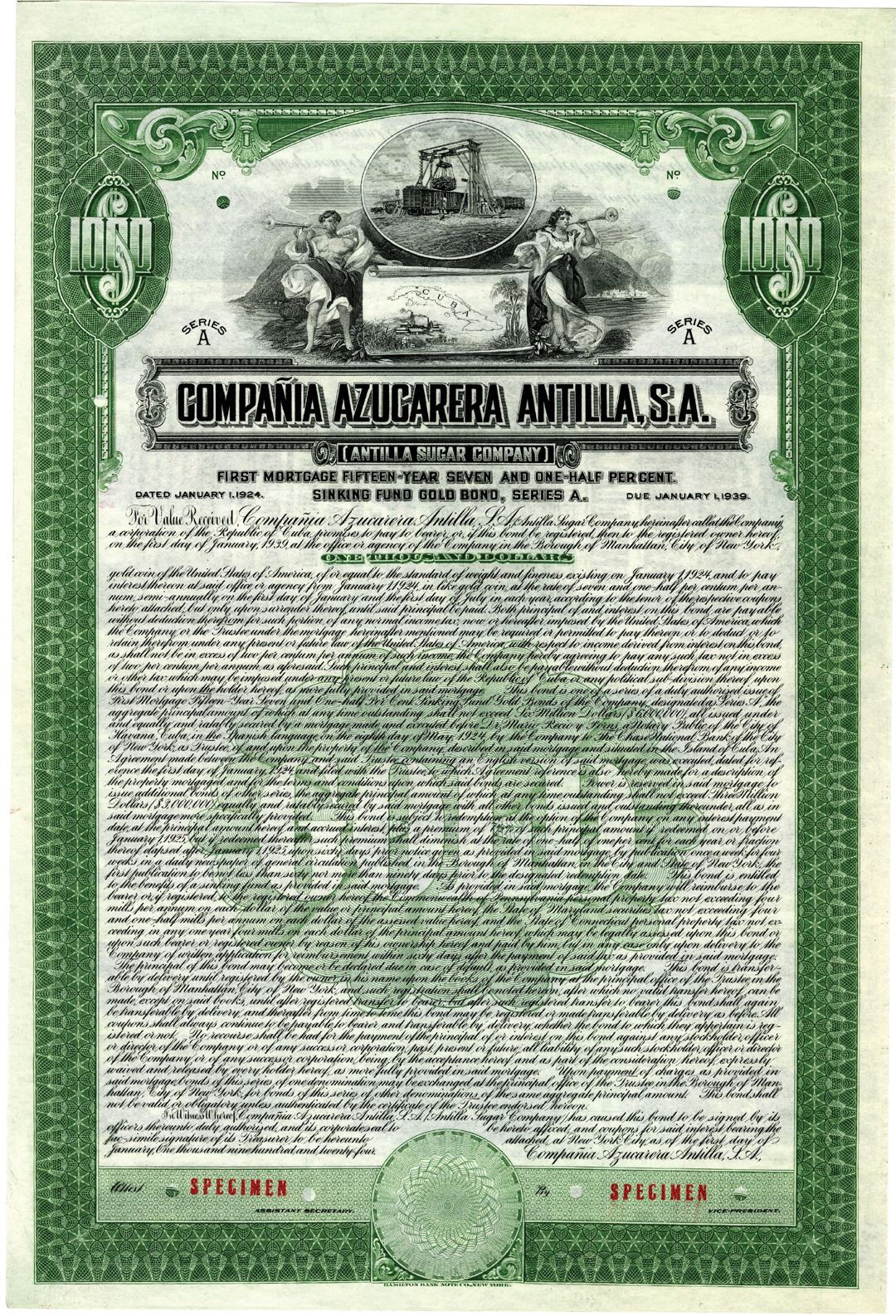 Cuba, 1924, Vertical $1000 1st. Mortgage 15 year 7 1/2% Sinking Fund Gold Bond Specimen Certificate, Green border with Allegorical horn blowers flanking map of Cuba and train being loaded with sugar cane, Specimen overprints, POCs, Coupons attached, HBNC, XF to Unc. condition.