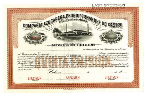Cuba. Odd Shares Common Stock Specimen Certificate, Black print on brown border and under tint printed in Spanish, Factory at center under company title, Specimen overprints and POC's, VF-XF condition, ABNC.