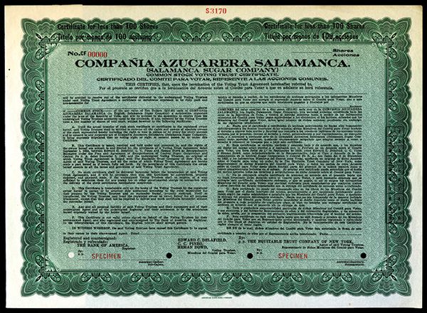 Compania Azucarera Salamanca, 1923 Specimen Voting Trust Certificate. Cuba, Odd Shares, Specimen stock certificate. Red Specimen overprints, "00000" serial numbers, POC's. XF condition. ABNC.